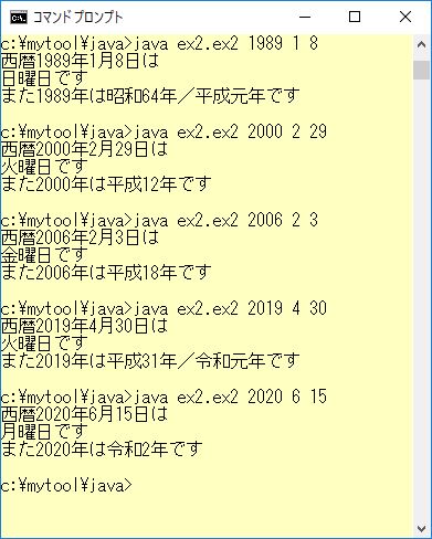 Java言語では豊富なクラスライブラリーが提供されておりますので、それをどういうふうに使いこなしていくのかが、使う人の力量ということになるのではないでしょうか。 また、最近のJava処理系では「 整数の仲間 年のデータ = 対象作成 整数の仲間( 引数[0] )」と書くと、推奨されていないというメッセージが出るようになりました。 これは「整数の仲間 年のデータ = 文字列を整数に変換( 引数[0] )」というように書き換えないといけないようです。 これは次のようなJava言語のコードに展開されます。(注:実際にはstd_include.jjava中の「// クラス関係」という注釈文字列が残りますが、この部分は割愛しています)