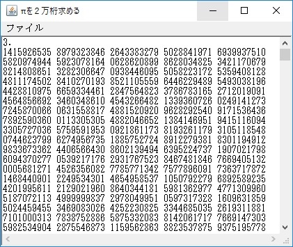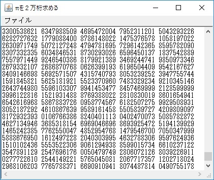 実際に長いπを求めるための詳細な計算部分です。それぞれ別々のクラスファイルとして翻訳(コンパイル)しておきます。