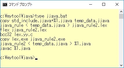 ここで、日本語定義の領域がかなり大きくなってきましたので、Java言語編ではC++言語編と同様、自分でよく使う予約語や演算子などの日本語定義部分をプログラムとは別に、外部である程度まとめて宣言できるようにしておきます。そして処理するときにバッチコマンドの機能を利用して、宣言ファイルと日本語Javaファイルを結合して、日本語定義部分を通常のJava言語に置き換えをするということにしました。